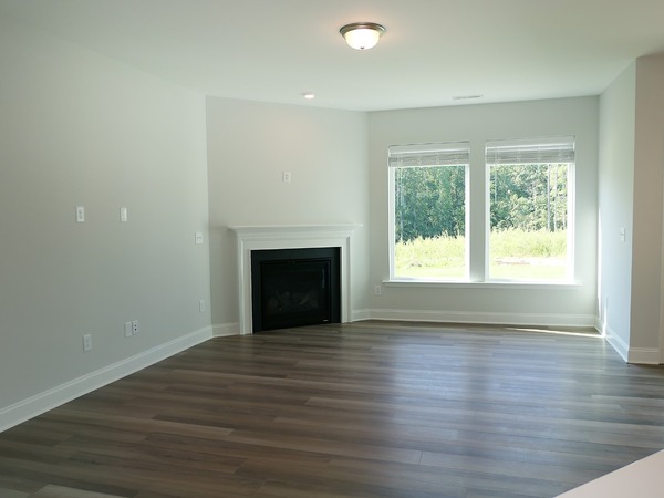 The home offers a bright and open floor plan on the main level. The open space combines the living area, dining space and kitchen. There is wood style plank flooring throughout the main level. There is a gas-log fireplace in the living area. The dining area opens out to the patio on the backside of the home. An island with pendant lighting and an overhanging breakfast or serving bar separates the kitchen from the dining space. The kitchen features granite counters, ample cabinets, a tile backsplash, recessed lighting, and stainless appliances. There is a large pantry closet in this area. The foyer to the garage includes a built-in coat tree, a half bathroom, and a large understairs closet. The loft and all of the bedrooms are on the upper level. There is carpet on this level of the home. The central loft offers a spacious flex room. There is a large closet in the loft. The master bedroom features a trey ceiling, an en suite bathroom, and a walk-in closet. The bathroom has a dual sink vanity and an oversized tile shower. The remaining bedrooms both have double door closets. The second bathroom has a tub shower. Both bathrooms have tile flooring. The patio in back leads out to the common greenspace. There is a ceiling fan on the patio. The home has an attached front entry two car garage. One small pet considered with fee and prior approval.