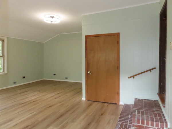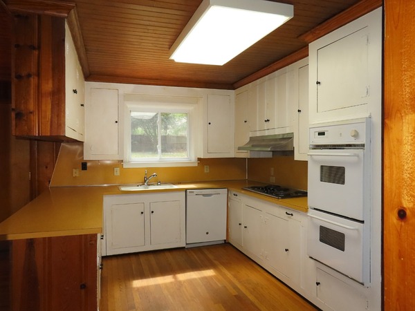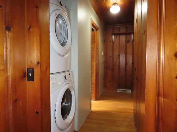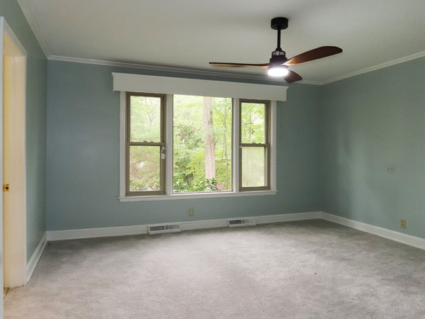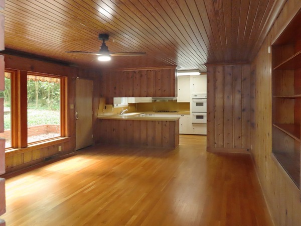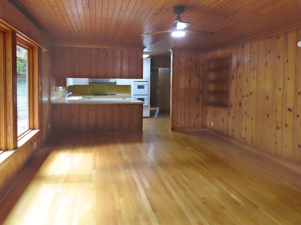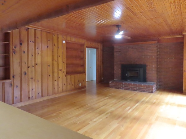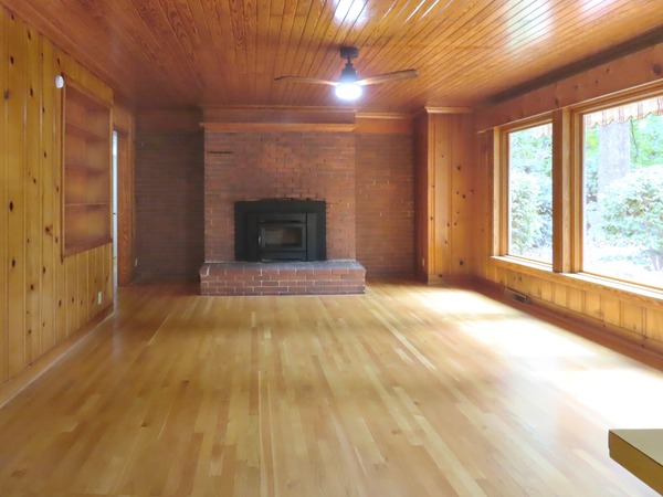 The combined living and dining areas are just off the entry foyer. This spacious room features a decorative (inoperable, not for use) fireplace in the living space. Large windows fill the room with natural light. This spacious room is detailed with crown molding. There is carpet in this room. There is a convenient entry between the dining area into to the kitchen. The family room is open to the kitchen through an over counter - under cabinet passthrough. There are hardwood floors, wood beadboard ceilings, and wood panels walls in the family room and kitchen. The family room features two built-in bookshelves, a ceiling fan, and a decorative woodstove (inoperable- not for use). The kitchen includes a cook-top, refrigerator, double wall oven, and dishwasher. There is a double door pantry in the adjoining rear hallway. A cubby on the hallway includes a stacked washer and dryer. The rear hallway steps down to the bonus room. This room provides for the fourth bedroom, with a large walk-in closet. This spacious room has wood-look flooring, a ceiling fan, and a sunny greenhouse style nook with flagstone flooring. The bonus-bedroom has an exit to the driveway. This room has a ductless mini-split for ac and heat. There is a bathroom on the hallway. This bathroom has a shower. The remaining bedrooms off the entry foyer. There is carpet in these three bedrooms. The master bedroom has a ceiling fan, a double door closet, and a private bathroom. The bathroom has tile flooring and a tub-shower. There is a ceiling fan and built-in desk in one of the remaining bedrooms. Both bedrooms are across from the shared hallway bathroom. This bathroom has tile flooring and a tub-shower. The backyard includes a brick patio and walkways, and natural and cleared spaces. There is ample parking in the driveway. There is a large attached storage closet at the end of the driveway. Pet with fee and prior approval. [Rear awning inoperable. Fence not secure.]