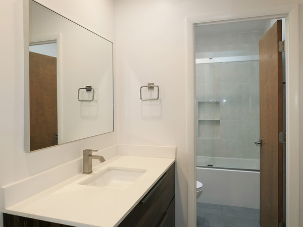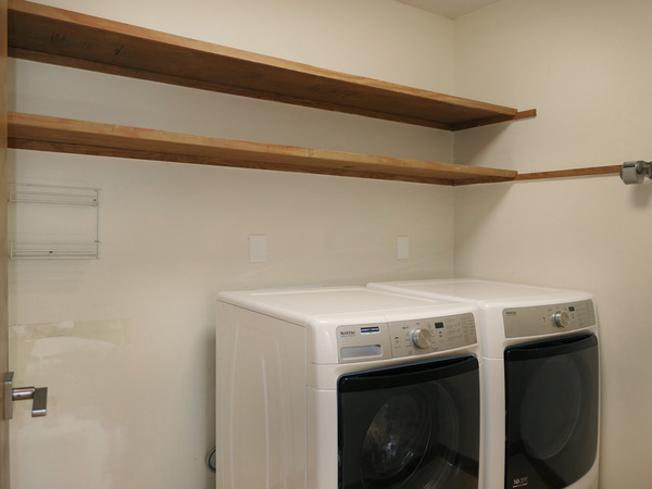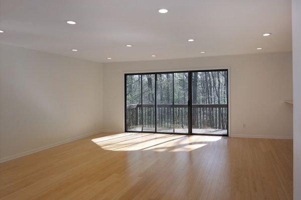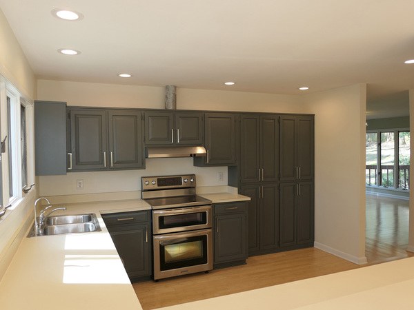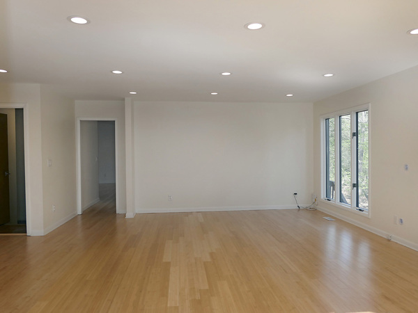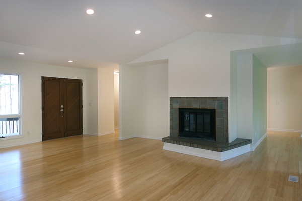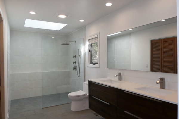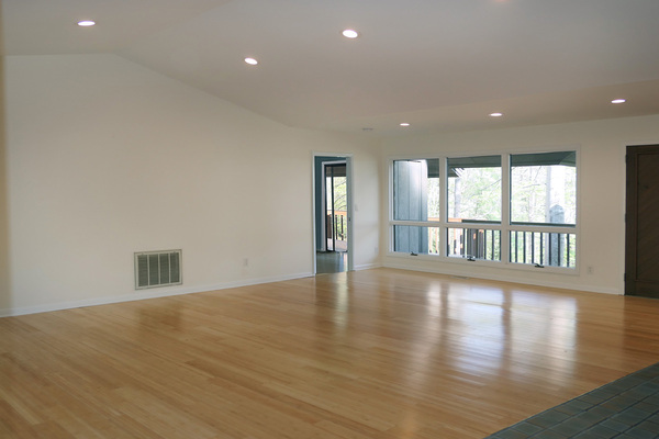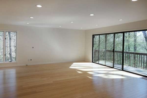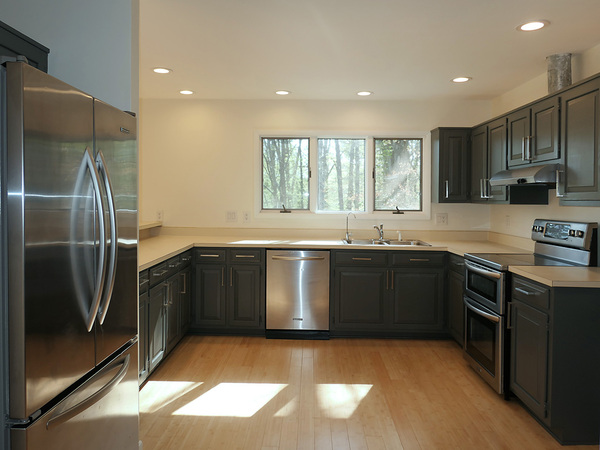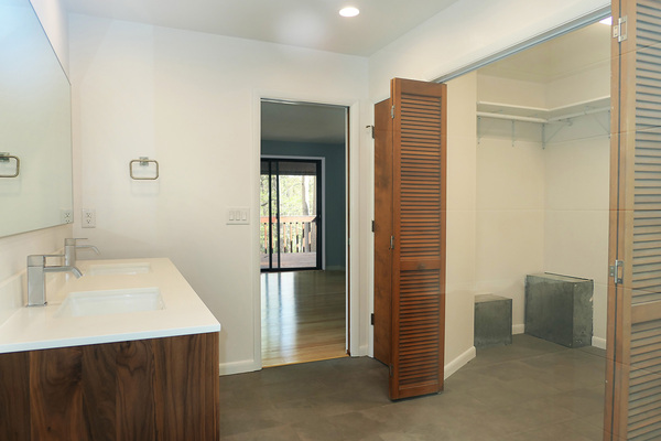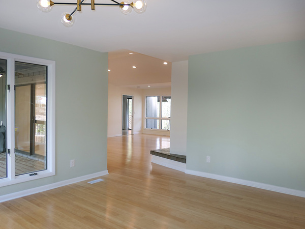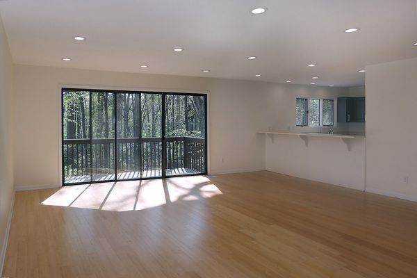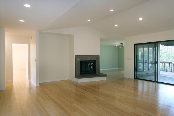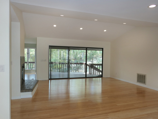 The front exterior stairway leads up to the entry of this one level contemporary. The home features bamboo flooring in the common rooms and master bedroom. The living room features a vaulted ceiling with recessed lighting and a fireplace with tile surround and hearth. A glass slider leads out from the living room to the rear deck and backyard. The rear deck includes a ceiling fan. The dining room is just off of the living room. Two walls of corner windows fill this space with natural light. The kitchen is open to the family room over a raised breakfast bar, and convenient to the dining space. The kitchen features stainless appliances, updated solid wood cabinets and recessed lighting. Abundant space in the family room allows for furnishings to define this versatile room. The family room also has recessed lighting. There is a slider for the family room out to the side balcony. The home features a split bedroom plan. The master bedroom is off the living room. This bedroom features a slider to the front deck and an en suite bathroom with a linen closet and a large walk-in closet. The master bathroom features tile flooring, a skylight, a dual vanity, and walk-in tile shower with dual shower heads including a rain shower. The remaining bedrooms and second full bathroom are of the foyer from the kitchen. Both of these bedrooms have carpet and wall length double door closets. One of these bedrooms has a slider to the rear deck and backyard. The second full bathroom has a separate vanity space, tile flooring, a skylight, and a tile surround tub-shower. An alcove hallway between the living room and family room provides for a coat closet and a half bathroom. A pocket door separates this foyer from the family room. The utility room with a washer and dryer included located by the kitchen completes the home. A stairway beside the laundry room leads down to the garage at the basement level. The oversized two car garage includes ample storage space as well as an under stairs closet. Pet considered with fee and prior approval.