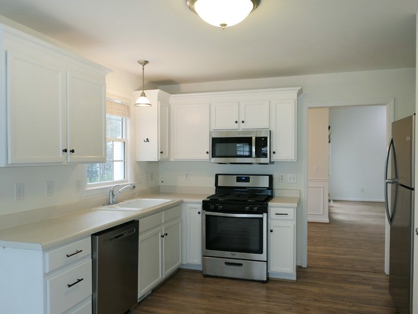 The living room, dining room, kitchen and breakfast area are on the main level - all with hardwood style laminate flooring. The living room features a fireplace and a ceiling fan there is an exit from the living room to the deck and fenced backyard. The dining room is convenient to both the living room and kitchen. This room features classic wainscoting and a bay window. The kitchen features white cabinets, over cabinet lighting, a pantry closet and included appliances. The kitchen combines with the breakfast area. A bay window offers natural light. The laundry closet is also in this room and includes a washer and dryer. A half bath completes the main level of the home. The bedrooms are on the second level, all with carpet and ceiling fans. The master bedroom has a vaulted ceiling, a walk-in closet and a private bathroom. There is a second full bathroom on this level of the home. Outdoors spaces include a rocking chair porch on the front side of the home, and a deck and fenced yard in back. This home has an attached one car garage. Pet with fee and prior approval.