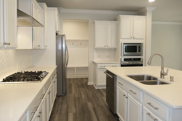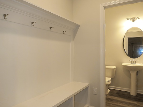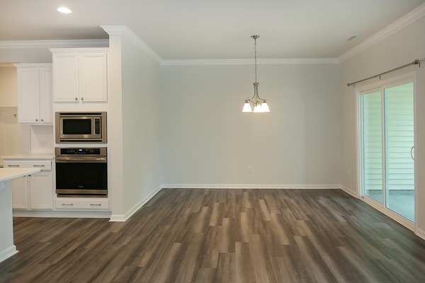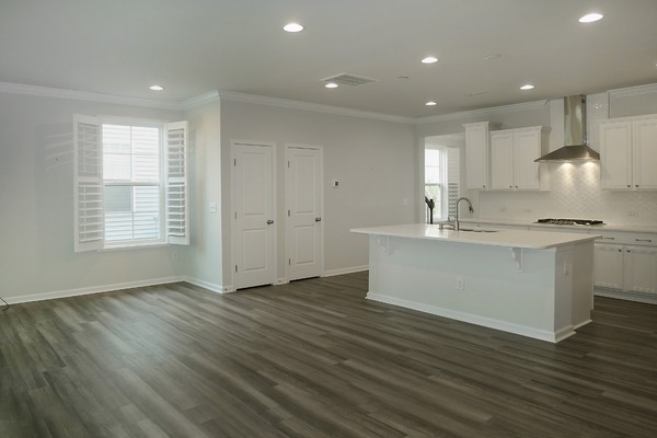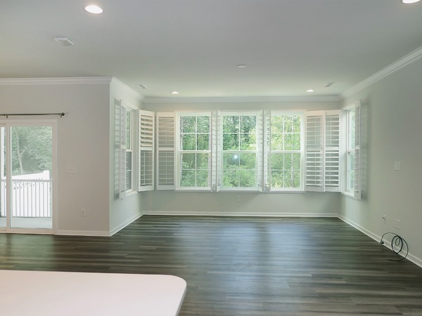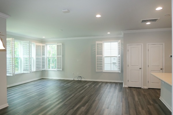 A covered entry leads into the front foyer. The main level features hardwood style plank floors and crown molding throughout. The windows on both levels have planation shutters. The open floor plan includes the living room, dining space and kitchen. The living area features a wall of windows, filling the space with natural light. A glass slider leads from the dining area to the screened porch on the back side of the home. The kitchen features quartz counter tops, a tile backsplash, white cabinets, a center island with a breakfast bar, a pantry closet, and stainless appliances. There are recessed lights in the living area and kitchen. The foyer to the garage entry includes a half bathroom and a hall tree. The bedrooms and loft area are on the second level of the home. There is carpet in the bedrooms and loft, and tile flooring in the bathrooms on this level. The spacious loft area has ample space for a bonus, playroom, or office. The master bedroom features a trey ceiling, an en suite master bathroom, and a large walk-in closet. The master bathroom includes a dual sink vanity, a tile surround shower with a bench, and a separate tub. The two remaining bedrooms both have walk-in closets. The second bathroom has a dual sink vanity and a tub-shower. The laundry room is on the second level and includes built in cabinets, a basin work sink, and a washer and dryer. In addition to the screened porch, there is a patio on the back side of the home. This home backs to a wooded buffer. There is a front entry two car garage. This community offers a greenspace picnic tables and a gazebo. Small dogs under 25 lb. will be considered with fee and prior approval, no cats or large dogs.