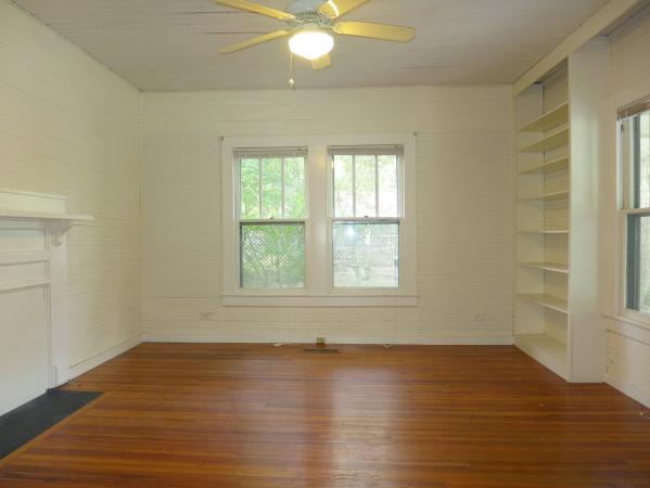 The living room is just off of the entry and includes a ceiling fan, classic molding and a decorative wood surround faux fireplace (inoperable, not available for use). The dining room is just off of the kitchen with a convenient pass through to the kitchen. The country kitchen has parquet floors and includes a gas range, refrigerator, and dishwasher. There is room for a table in the kitchen. Just off of the kitchen is a full bathroom with a shower combined with the laundry space. A washer and dryer are included. The master bedroom is on the main level and has built in shelves, a decorative (inoperable) fireplace, and a ceiling fan. A second bedroom or study is on the main with built in shelving and a ceiling fan. A spacious loft on the second can be used as a bonus or study area. There are two bedrooms on the second level. All of the bedrooms have windows a/c units, the bedrooms up have wall heat units. This home offers a fenced yard in back. Pet with fee and prior approval.