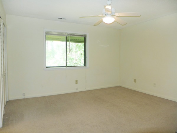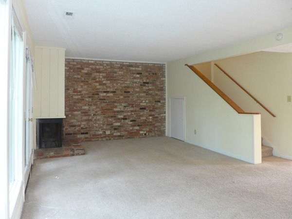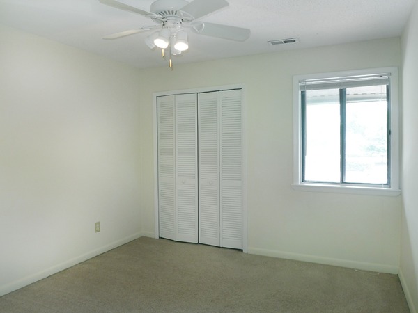 The living area and dining area combine, with a corner fireplace and exposed brick wall accenting the living area. There is carpet in this room. A wall of windows provides natural light and looks out to the patio and green space behind the unit. There is an exit from this room to the private patio area. The kitchen has white cabinets and kitchen appliances are included. A washer and dryer are also included. The main level is completed by the half bathroom. The bedrooms are on the second level, all with carpet and ceiling fans. The master bedroom has two closets and a private bathroom with tile floor and a custom tile shower. The remaining full bath is on this level. The patio area includes a storage closet. This unit includes a reserved parking space, there is additional neighborhood parking available. Water and sewer are included. Pet with fee and prior approval.