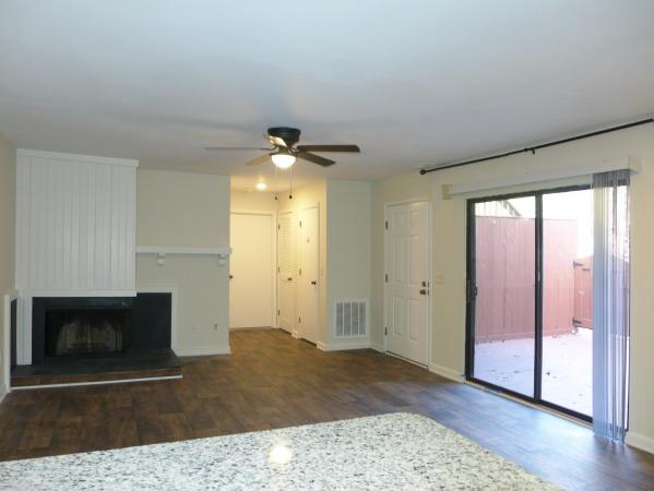 This updated home has a private fenced courtyard deck entry. The open floor plan includes the combined living and dining areas and the kitchen, all with hardwood style plank flooring. The living area features a ceiling fan, and a corner fireplace with a panel accent wall and a slate hearth. There is a slider from the living room to the courtyard. The kitchen features granite counter tops, white cabinets, and a subway tile backsplash. An oversized serving or breakfast counter separates the kitchen from the living room. Kitchen appliances are included. A washer and dryer are also included and located in the closet in this common space. This condo features a split bedroom plan. Both bedrooms have carpet and large mirrored closets. The master bedrooms has a ceiling fan and a walk-in closet with a walk through to the private master bath. The master also features a glass slider to the courtyard. The second bedroom has a full wall closet, and direct door to the second shared bathroom. The second bathroom has a shower. Permit parking included, with parking nearby. There is a storage closet on the deck. Pets under 40 lb. will be considered with an additional pet fee.