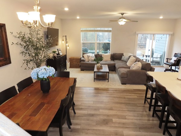 Step into an entry hall with a half bath, coat closet, built-in hall tree, and garage access. A center island and breakfast bar separates the kitchen from the living and dining space. The kitchen features quartz counters, tile backsplash, and stainless appliances. There is wood look plank flooring throughout the main level of the home. A glass slider leads from this space to the back patio. The bedrooms, full bathrooms, loft space and laundry room are on the upper level. This level is carpeted, with wood look plank flooring in the bathrooms. The master bedroom features a tray ceiling with a ceiling fan, walk-in closet, and a private bathroom with a double vanity and tile surround shower. Each bedroom has a ceiling fan. The second bathroom features a tub shower. A loft space completes this level, perfect for use as an office or reading nook. The patio behind the home has privacy panels on both sides. The garage has space for one car. There is a dog park and a playground across from the home. Pet with fee and prior approval. The unit will be unfurnished, furniture in photos is not included.
