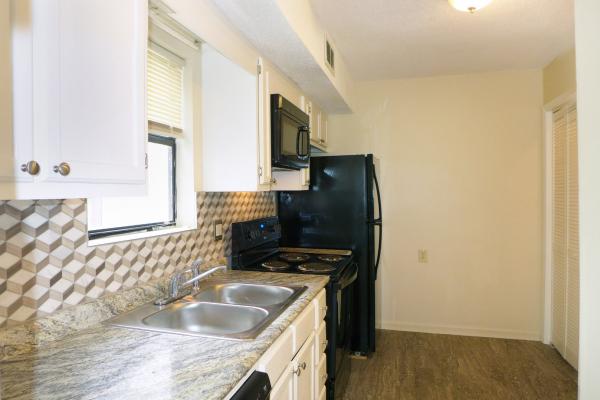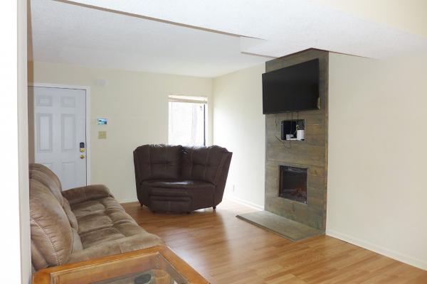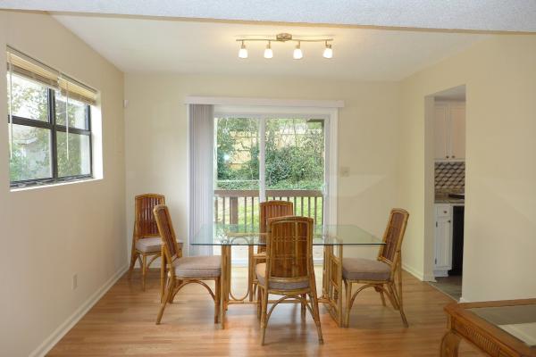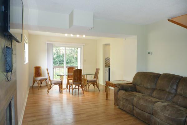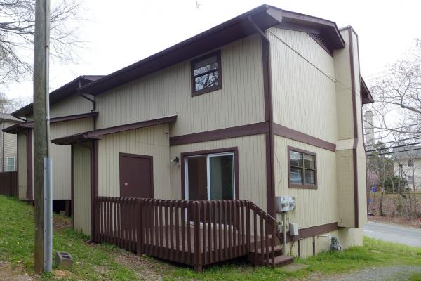 This home is convenient to downtown Chapel Hill, downtown Carrboro and UNC Campus. A deck style front porch welcomes you to the home. The living area is open to the dining space, all with hardwood style laminate flooring. The living area features a wood accent paneled wall with an electric fireplace and a built-in shelf. The dining area leads out to the rear deck through a glass slider. There is a storage closet on the deck.